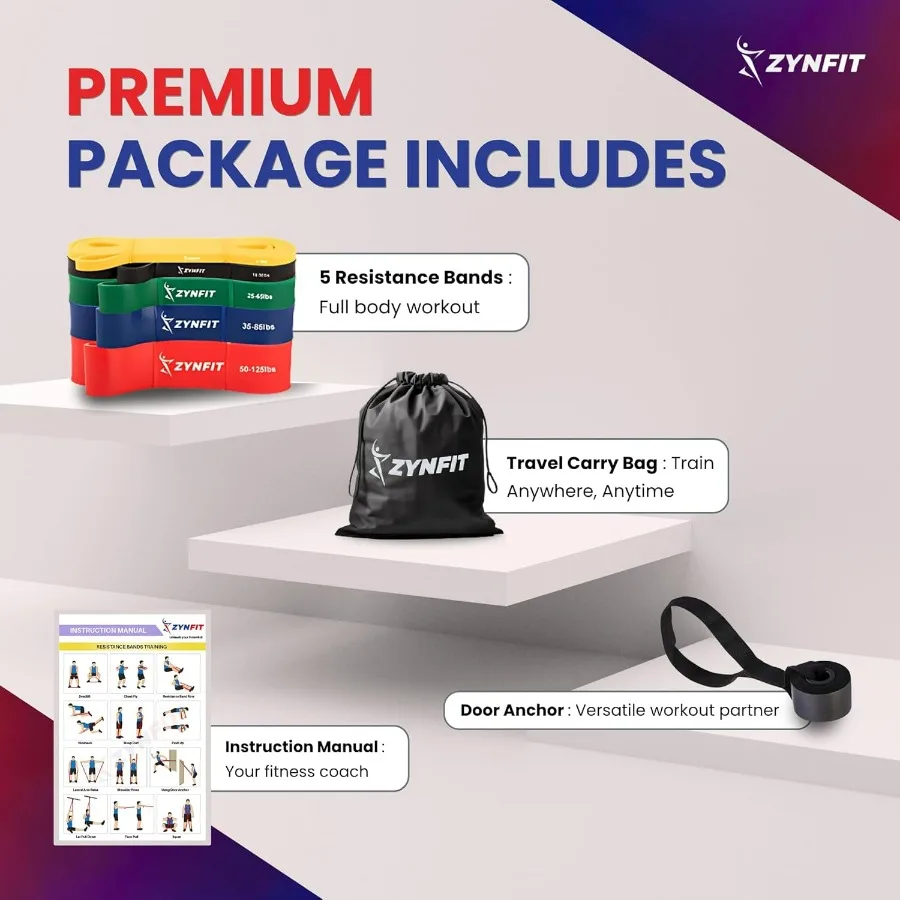 COMPLETE SET INCLUDED: 5 resistance bands ranging from 5 lbs to 125 lbs, 1 door anchor, 1 black travel carry bag, 1 workout manual. These stretch bands for exercise also works as resistance bands for pull ups for home, gym, hotel room or travel use.